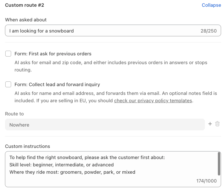 Du kannst Deep Links mit Custom Routings kombinieren, damit der Chatbot exakt so antwortet, wie es für Euren Shop sinnvoll ist. Ab dort übernimmt die KI die komplette Beratung.